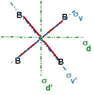 Es gibt 5 Symmetrieebenen. Eine Symmelrieebene liegt in der Molekül-(Papier-)ebene. Sie soll nicht weiter betrachtet werden. Die übrigen 4 sind in der folgenden Abbildung eingezeichnet. Sie gehören 2 verschiedenen Typen (Lehrschritt 68) an und werden mit sv und sd bezeichnet.