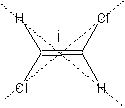 Ihre Antwort ist richtig! Der in der folgenden Abbildung eingezeichnete Punkt i stellt das Symmetriezentrum dar, an dem eine Punktspiegelung ausgeführt werden kann. Der Punkt i liegt in der Mitte zwischen beiden C-Atomen. Man kann sowohl die beiden H-Atome als auch die beiden Cl-Atome durch Geraden verbinden, die durch diesen Punkt laufen. Sowohl die H-Atome als auch die Cl-Atome haben jeweils untereinander den gleichen Abstand vom Symmetriezentrum. Gehen Sie nun zu Schritt 30!