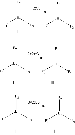 Bei der Drehung um 120° (2p/3) und 240° (2 * 2p/3) werden äquivalente, von der ursprünglichen Struktur ununterscheidbare Atomanordnungen im Molekül erhalten.Wird eine Drehung um 360° (3 * 2p/3) durchgeführt, erhält man nicht mehr nur eine äquivalente, sondern die identische Anordnung. Das wird klar, wenn Sie die Fluoratome numerieren, wie es in der folgenden Abbildung getan ist, und die beschriebenen Symmetrieoperationen ausführen.